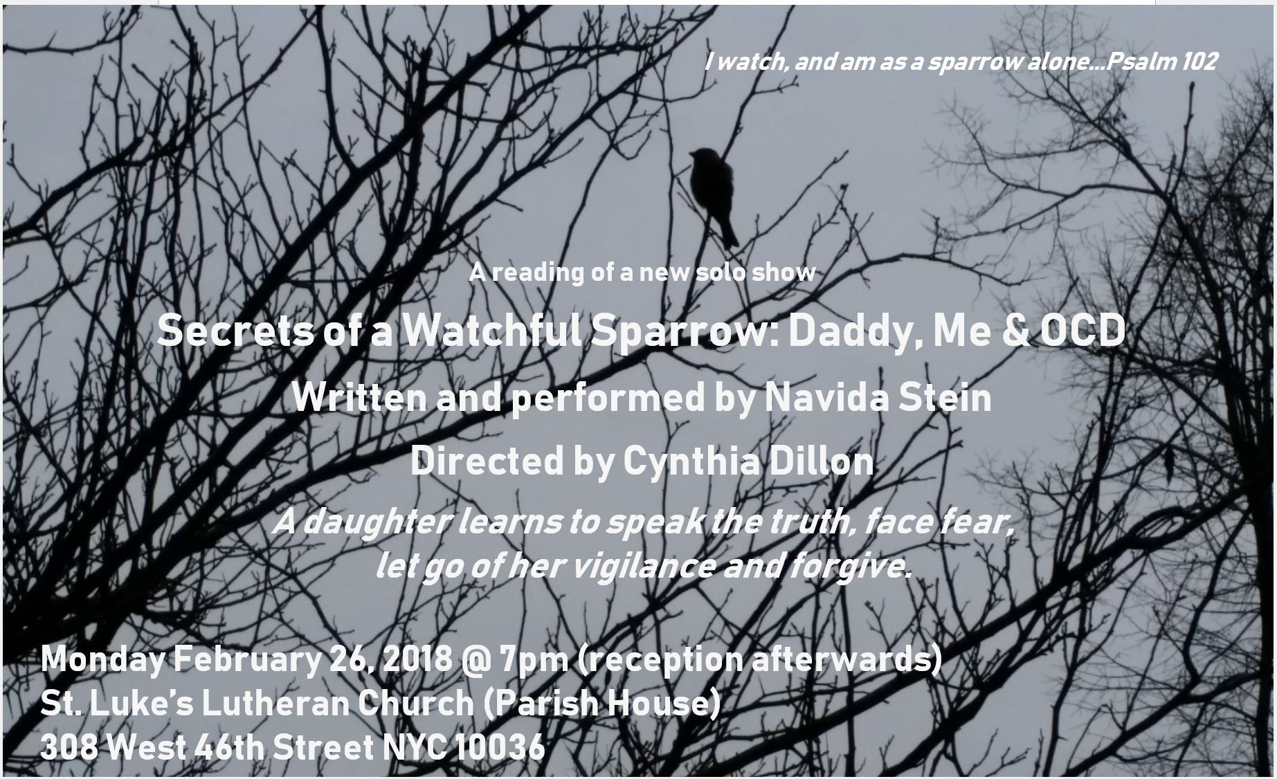 Written and performed by Navida Stein. Directed by Cynthia Dillon. A daughter learns to speak the truth, face fear, let go of her vigilance and forgive. Reception to follow.