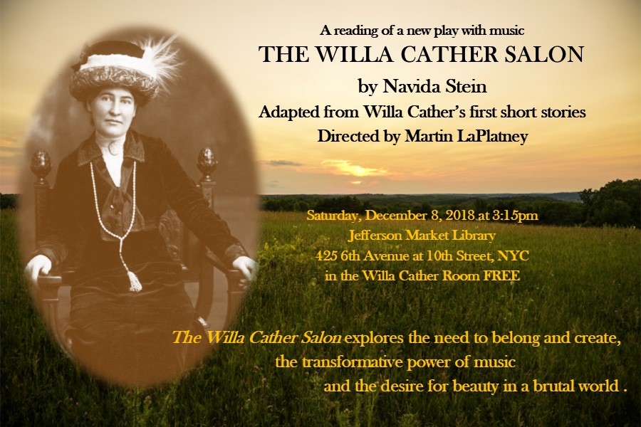 The Willa Cather Salon is a new play with music written by Navida Stein and adapted from Willa Cather’s first short stories published in early 20th century magazines.  In this reading of The Willa Cather Salon the stories are told by a cast of actor/singer/storytellers and woven together with vocal and instrumental music from the turn of last century. These stories explore the need to belong and create,  the transformative power of music and the desire for beauty in a brutal world; all themes Willa Cather continually explored throughout her life’s work.  As an adult, Willa Cather made New York City her home and lived for many years at 5 Bank Street in Greenwich Village, right around the corner from Jefferson Market Library, with her lifelong companion, Edith Lewis.  Miss Cather would hold very popular salons on Friday afternoons; writers, musicians, actors and opera singers would come for tea, conversation and share their art. Willa Cather (1873-1947) is an American writer best known for her novels O Pioneers!, The Song of the Lark, and My Ántonia. She won the Pulitzer Prize  in 1923 for her World War I novel One of Ours.